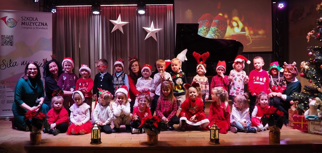Bohaterem występów był także imponujący fortepian, którego dźwięk towarzyszył Młodym Artystom, dodając koncertowi wyjątkowego uroku. W Sali Koncertowej panowała zimowo-świąteczna aura – pełna ciepła, radości i pięknych brzmień. Kolejną atrakcją była aktywna zabawa muzyczna, podczas której przedszkolaki z entuzjazmem grały na janczarach, grzechotkach i kashishi - akompaniując do dobrze znanej piosenki Zima, zima, zima, pada, pada śnieg. Cała sala wypełniła się śmiechem, energią i radosną wspólną zabawą. Na zakończenie nie zabrakło gromkich braw, wyrazów ogromnego uznania dla Młodych Muzyków i Prowadzących,  podziękowań, prezentów i słodkości – także od naszej Pani Dyrektor – Renaty Śliwa.