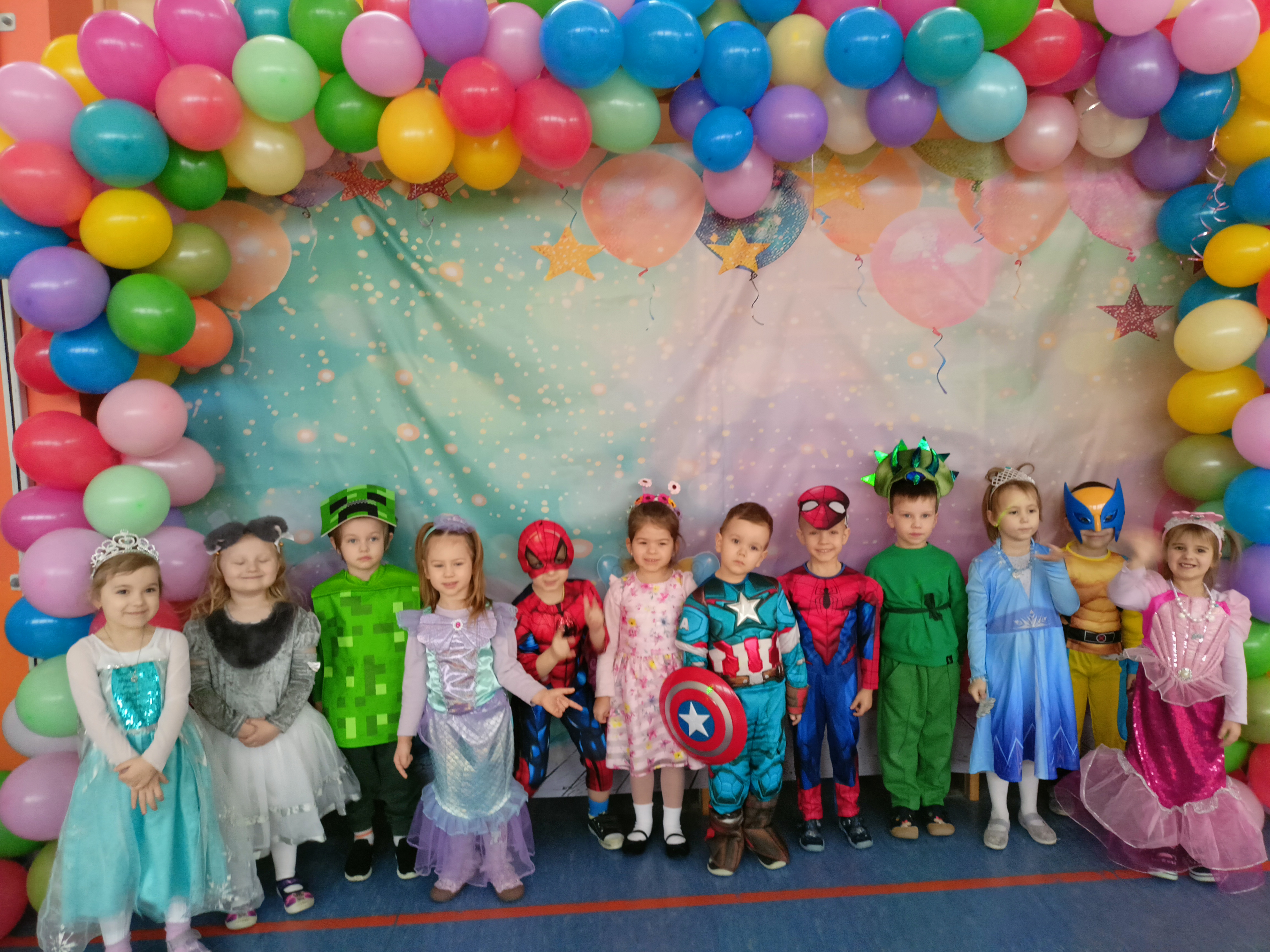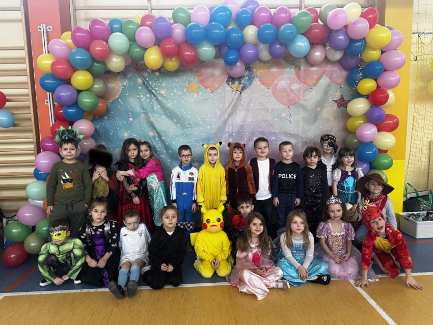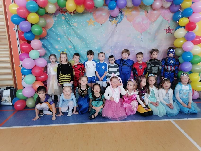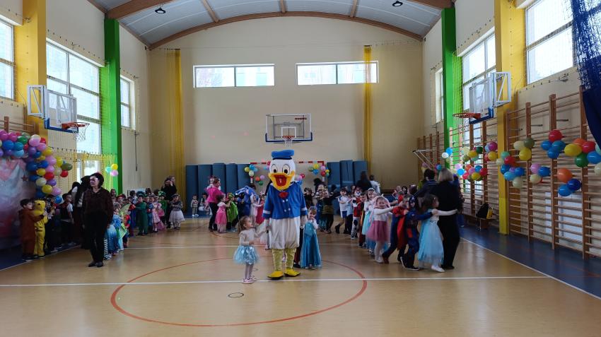 Sala gimnastyczna na ten wyjątkowy dzień zamieniła się w kolorową, bajkową przestrzeń. O piękny i pomysłowy wystrój zadbali rodzice, którzy z wielkim zaangażowaniem przygotowali dekoracje. Serdecznie dziękujemy rodzicom za poświęcony czas, kreatywność oraz ogromne wsparcie – dzięki nim atmosfera balu była naprawdę wyjątkowa. Tego dnia przedszkolaki pojawiły się w barwnych i pomysłowych przebraniach. Wśród uczestników można było spotkać księżniczki, superbohaterów, zwierzątka oraz wiele innych bajkowych postaci. Dzieci z dumą prezentowały swoje stroje i chętnie brały udział we wspólnej zabawie.